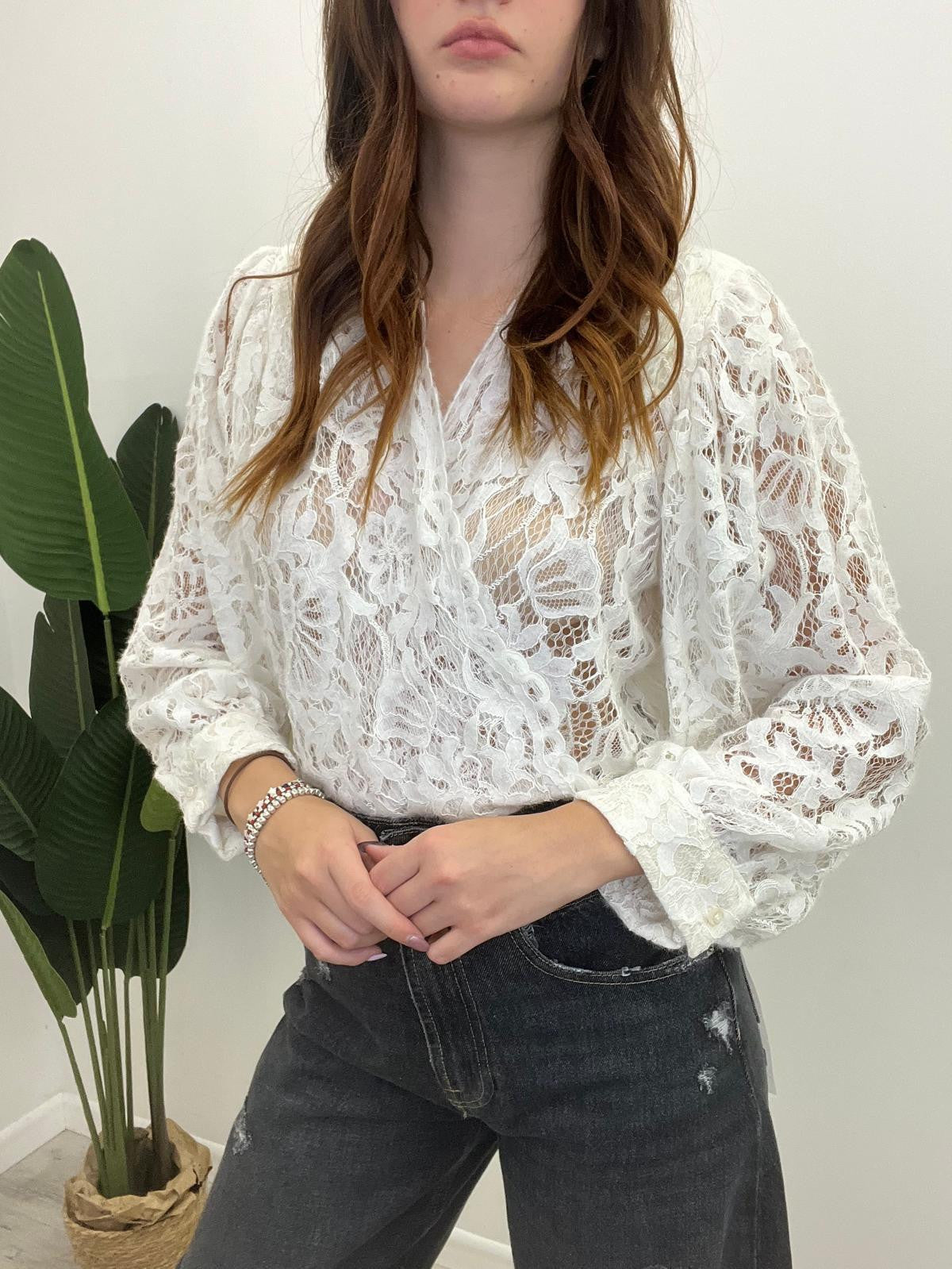 Body in pizzo a manica ampia lunga con spalline imbottite e scollo a V incrociato, chiusura dei polsini tramite bottoncino e slip in tessuto elasticizzato tono su tono.