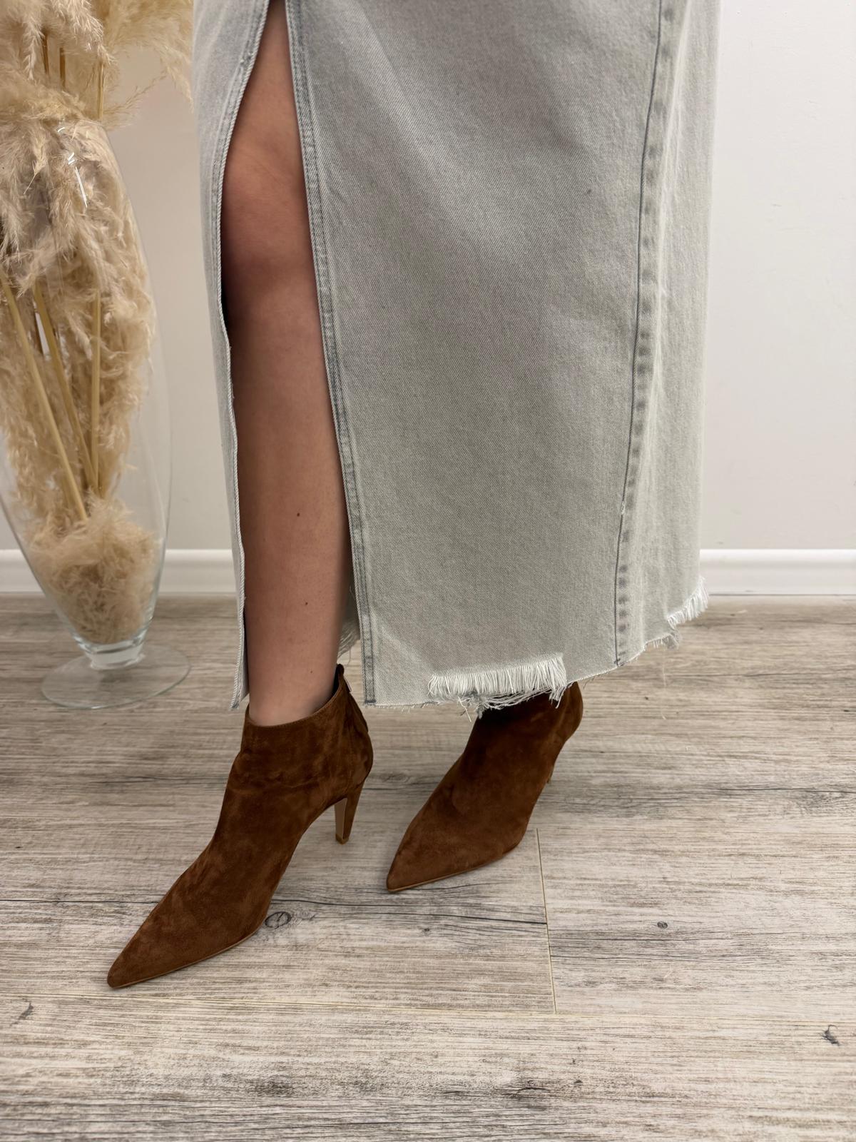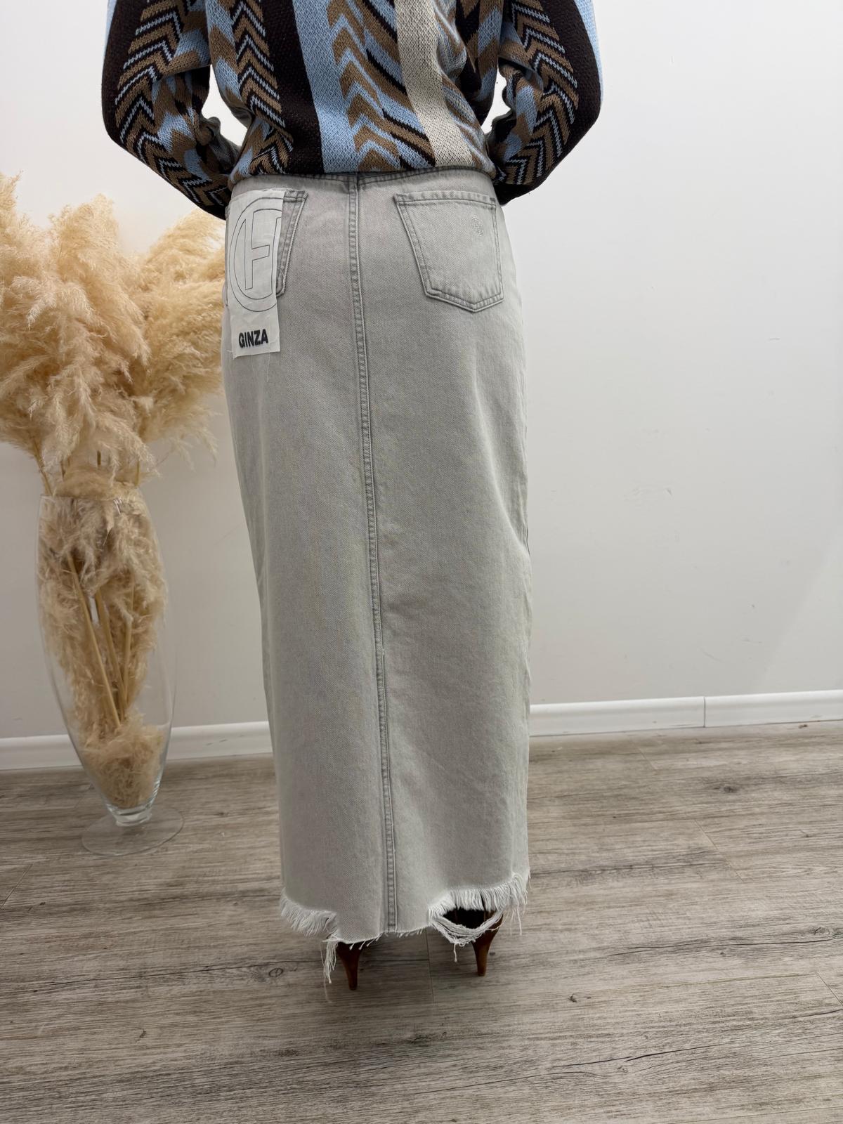Gonna di jeans a 5 tasche lavaggio grigio chiaro effetto leggermente slavato con spacco frontale e fondo leggermente sfrangiato, passanti in vita e chiusura mediante bottone più zip.