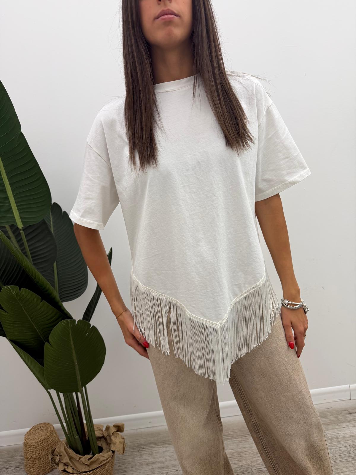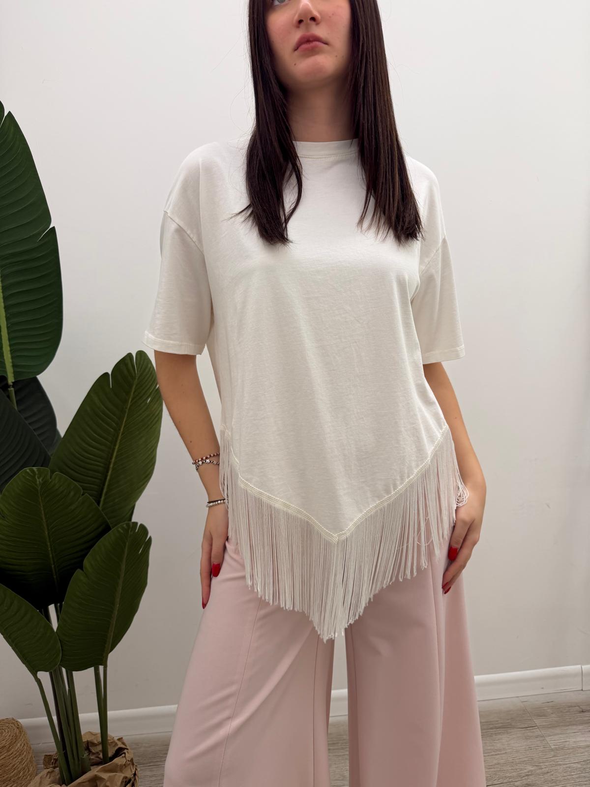 Tshirt a girocollo in cotone con fondo a punta più frangette cucite.