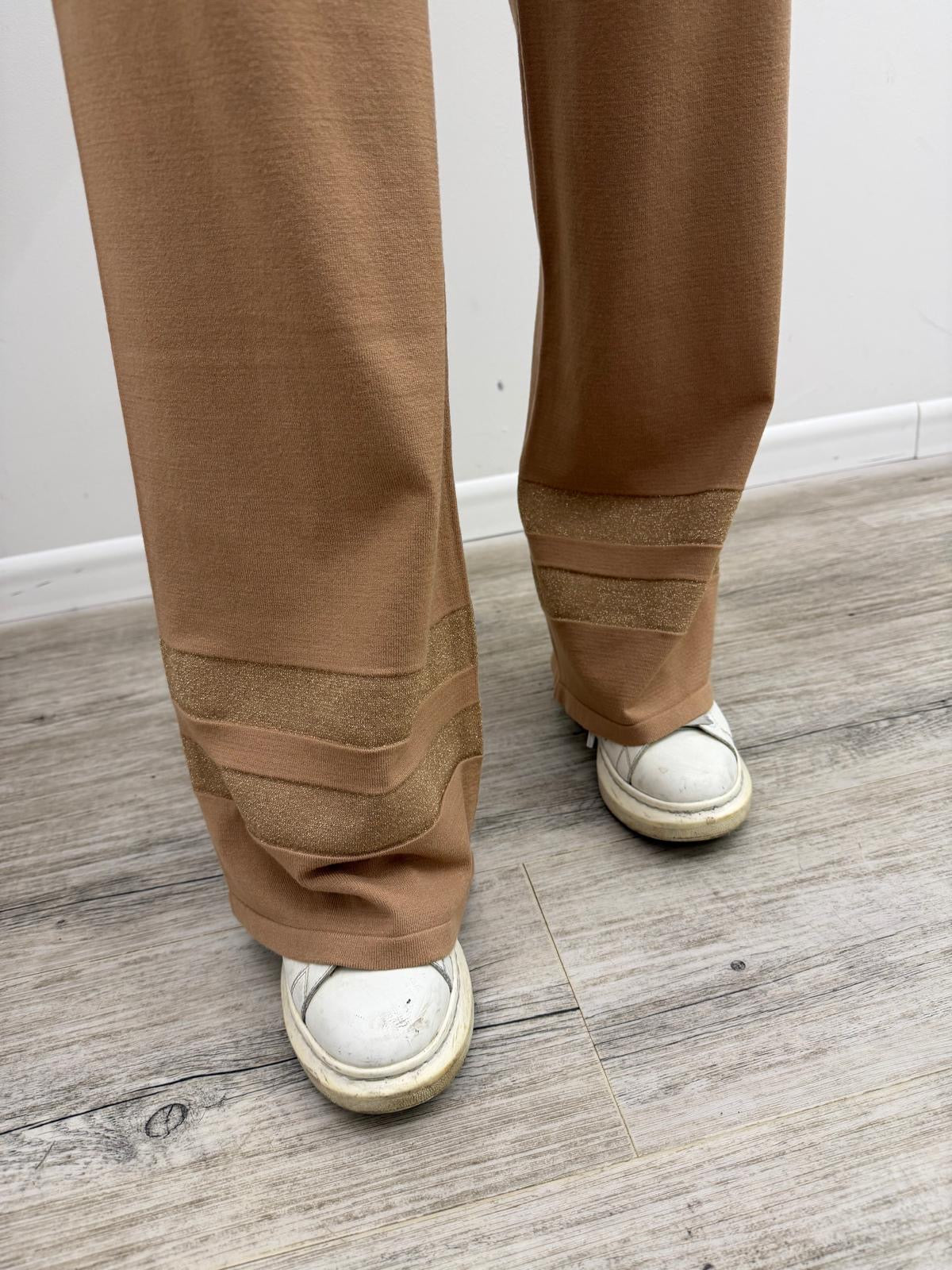 Pantalone in maglia con doppia riga lurex tono su tono sul fondo ed elastico in vita.
