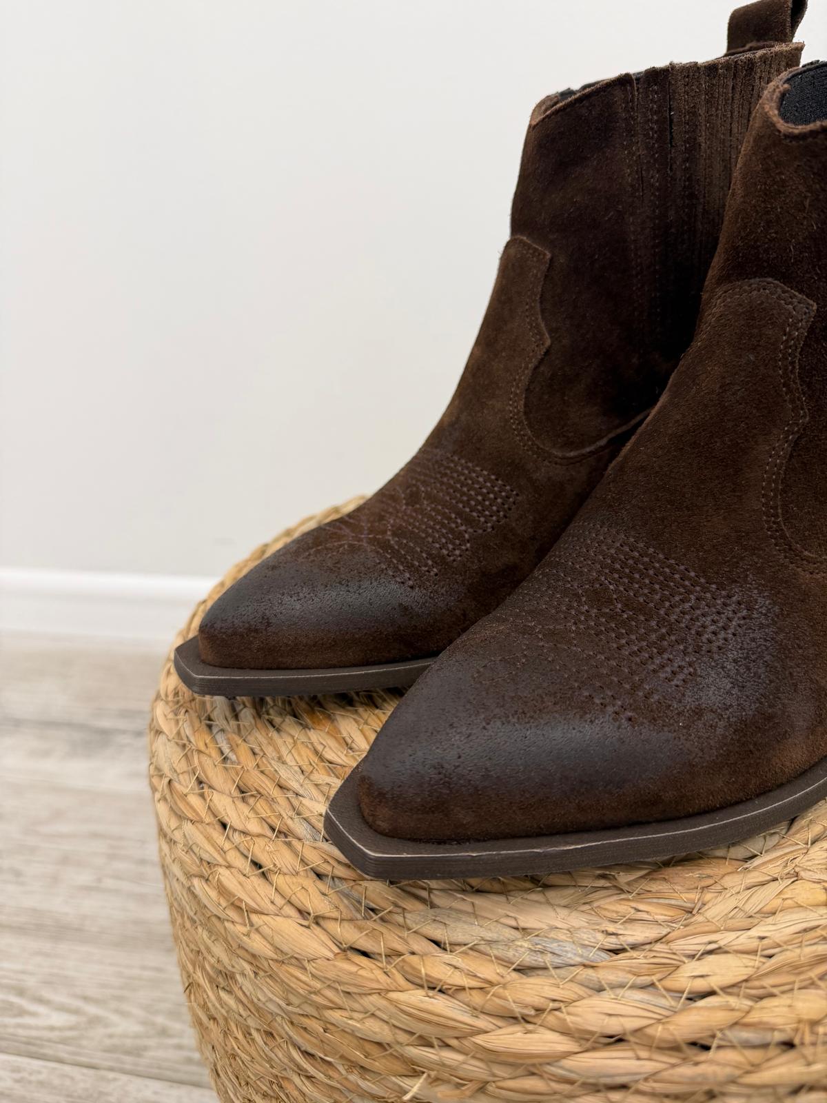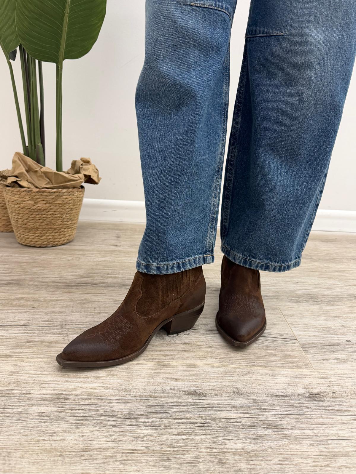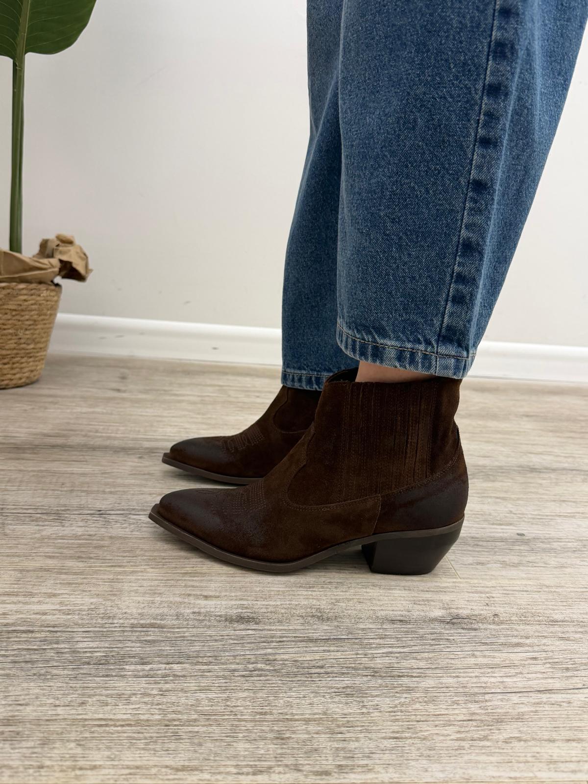 Stivaletto modello texano in pelle scamosciata colore moro con inserti elasticizzati tono su tono ai lati, ricami decorativi sul davanti e senza chiusura.