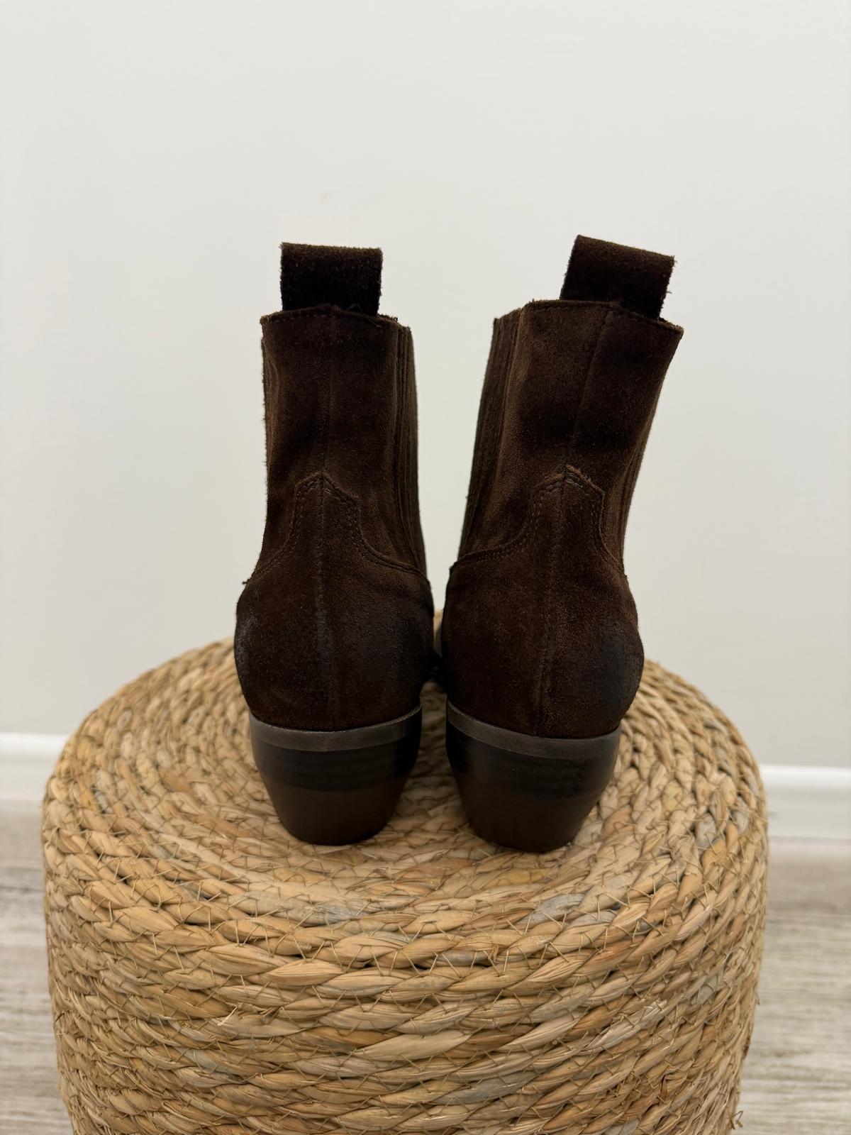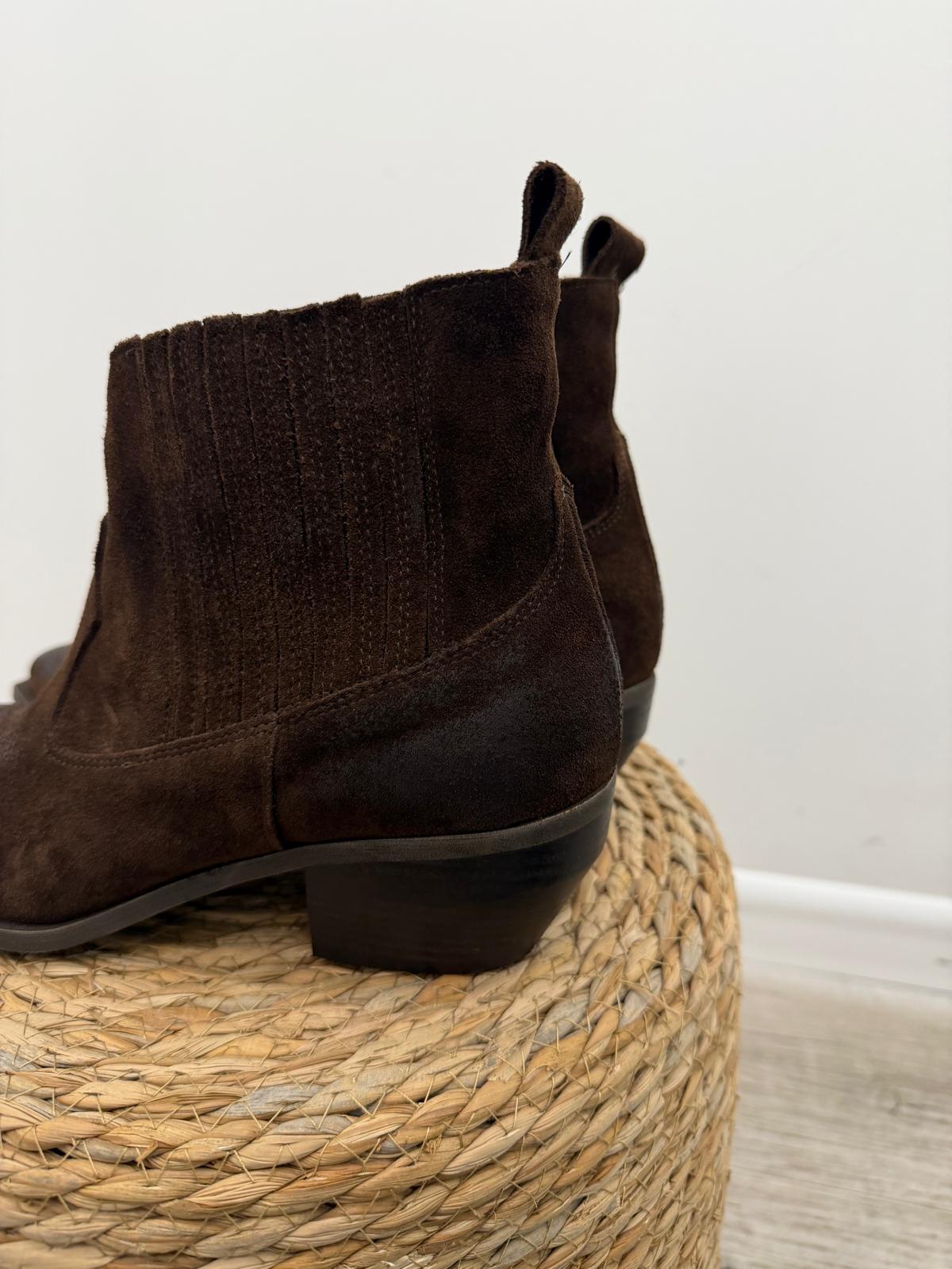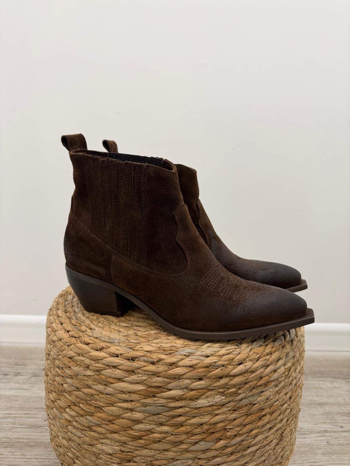 Stivaletto modello texano in pelle scamosciata colore moro con inserti elasticizzati tono su tono ai lati, ricami decorativi sul davanti e senza chiusura.