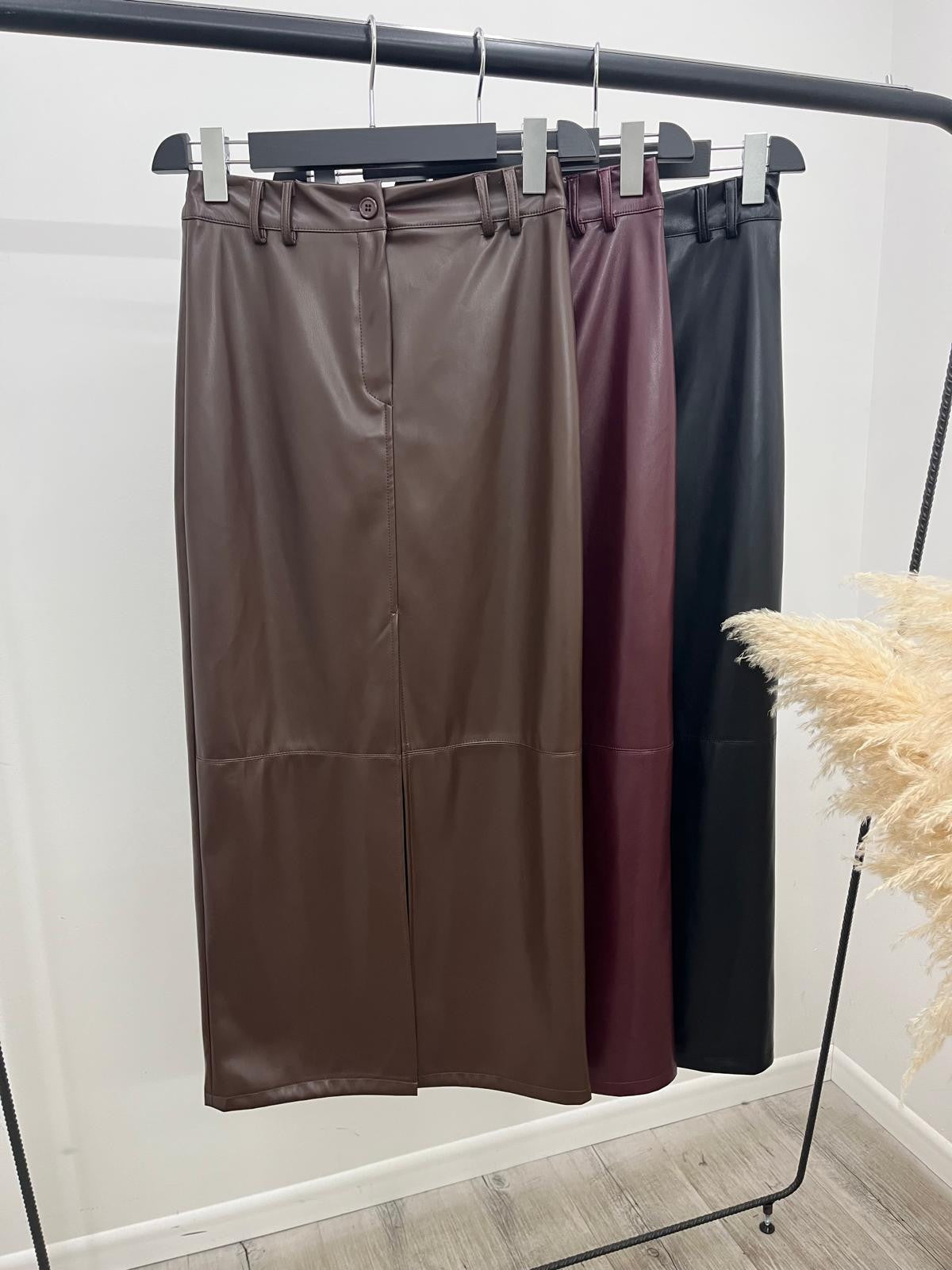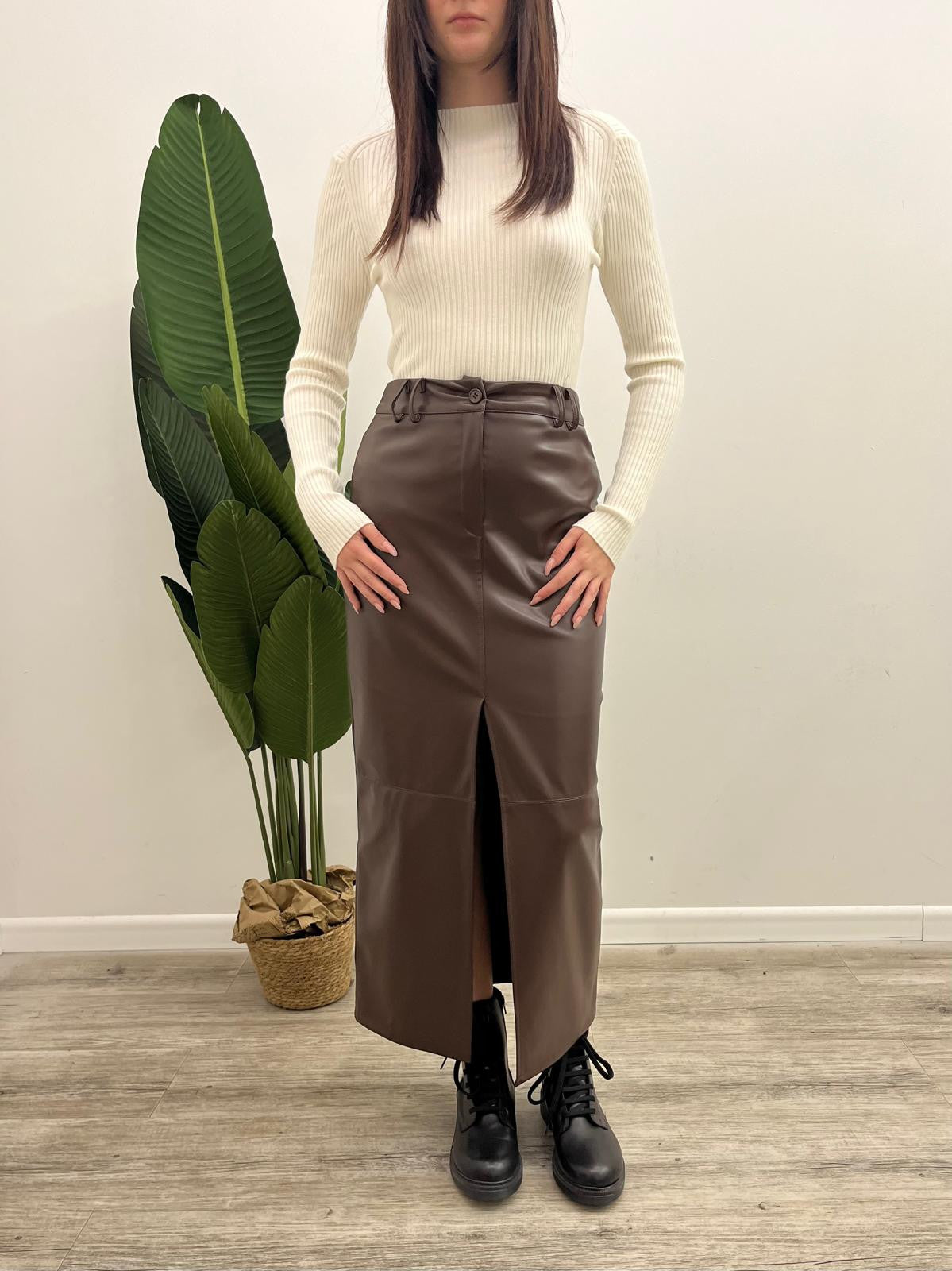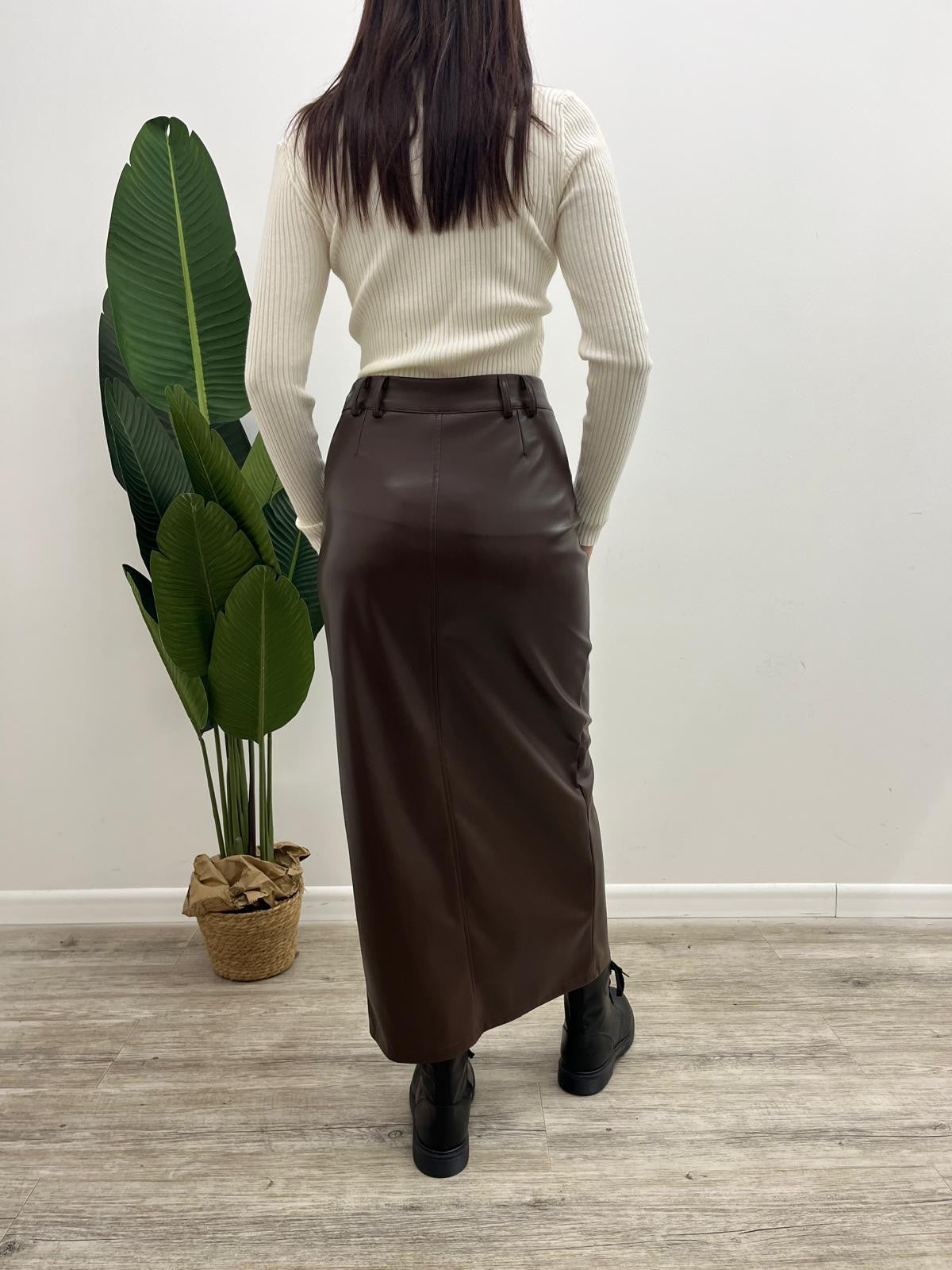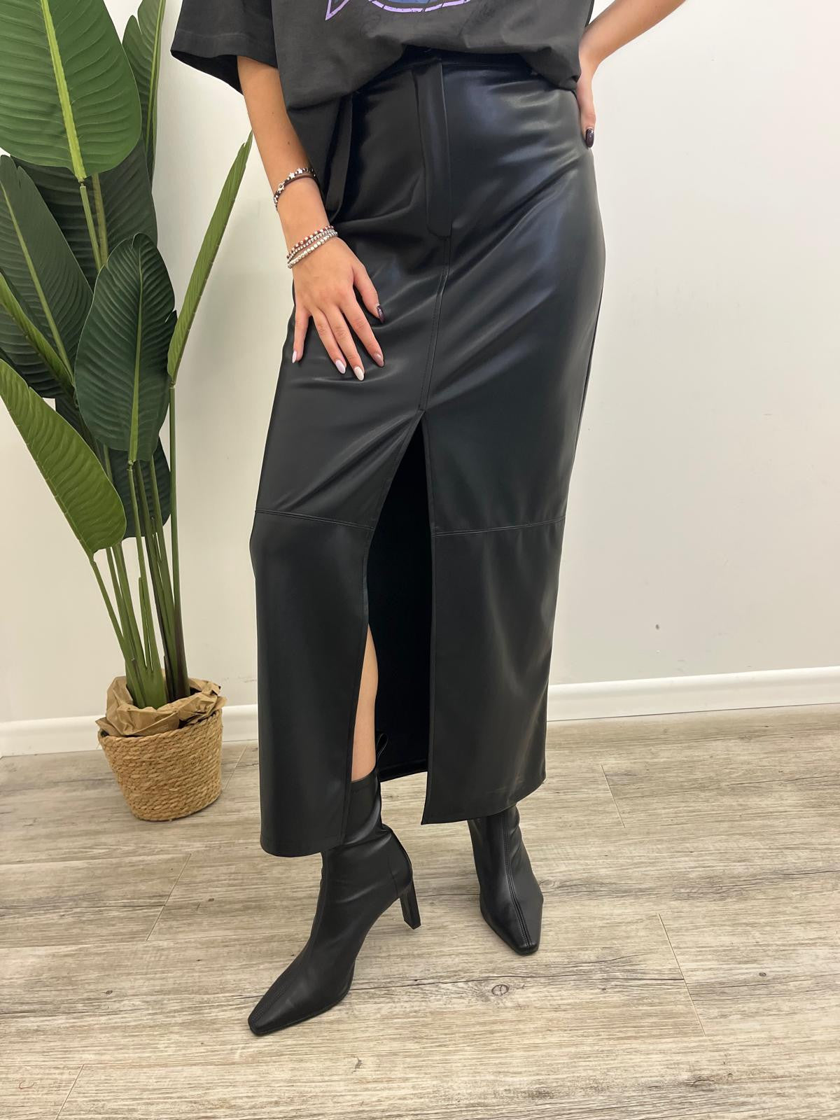 Gonna lunga in ecopelle effetto martellato con spacco frontale, passanti in vita e chiusura mediante bottone più zip.