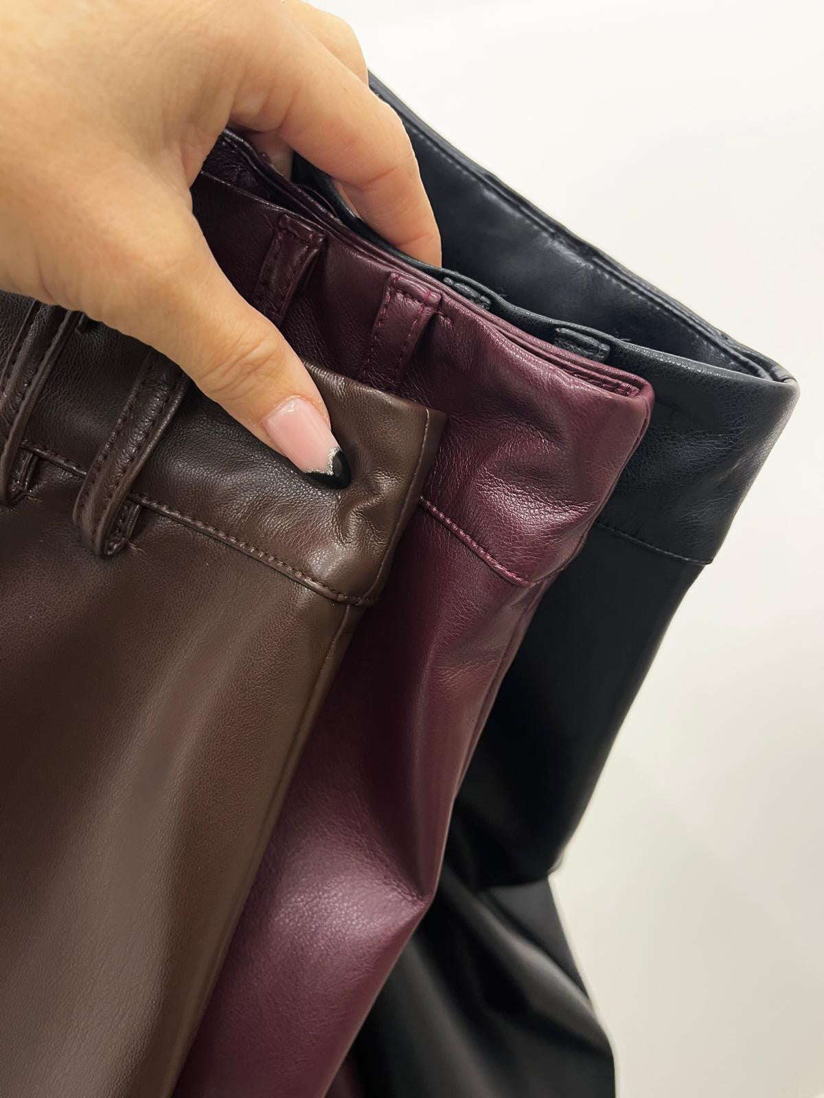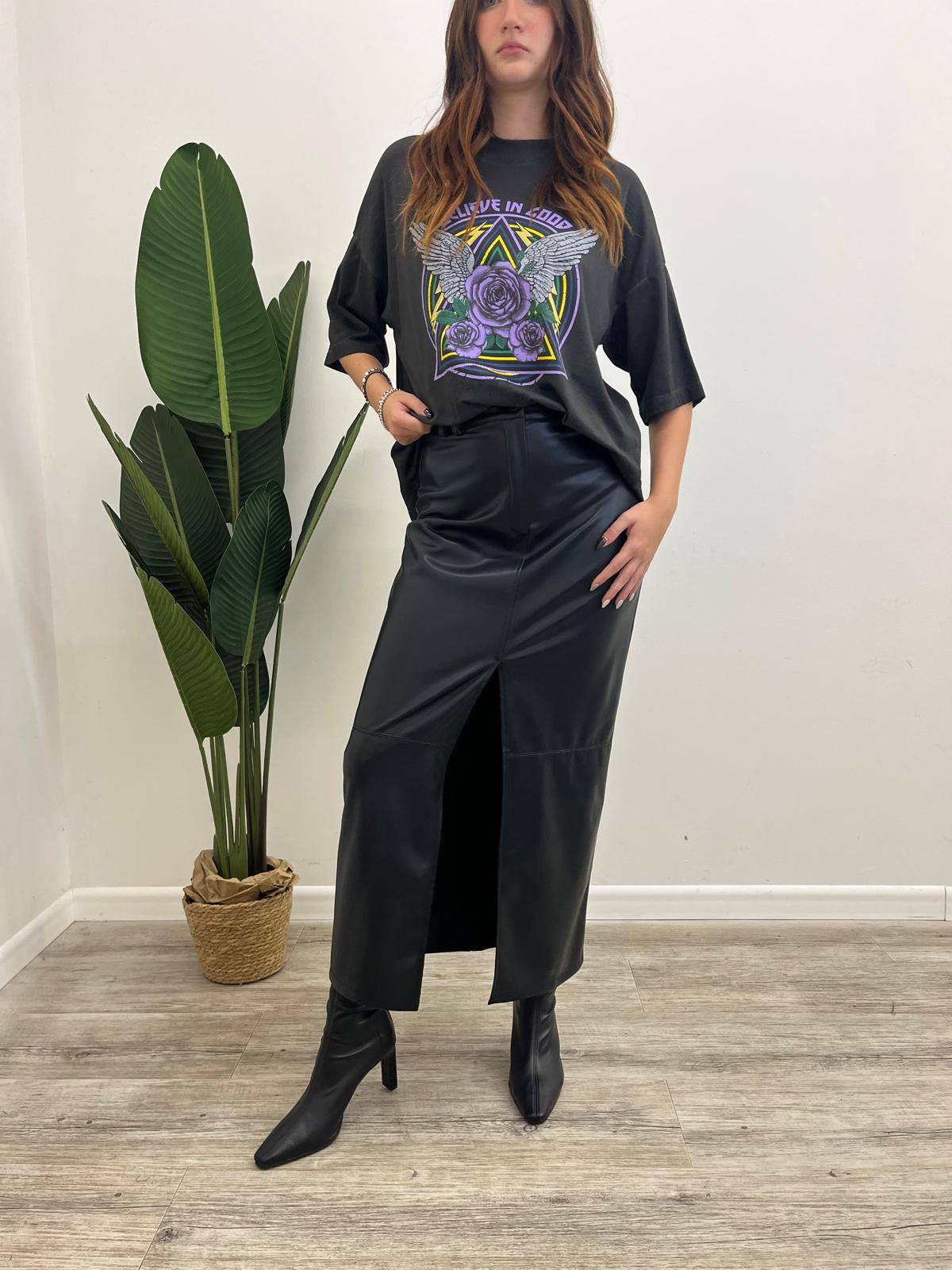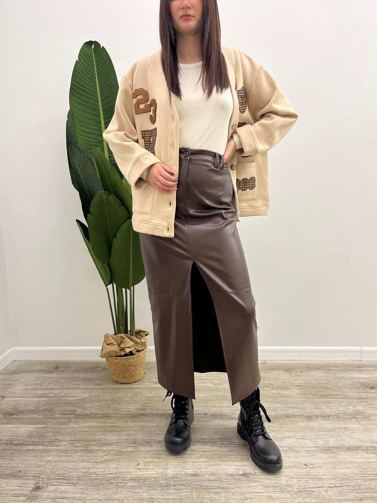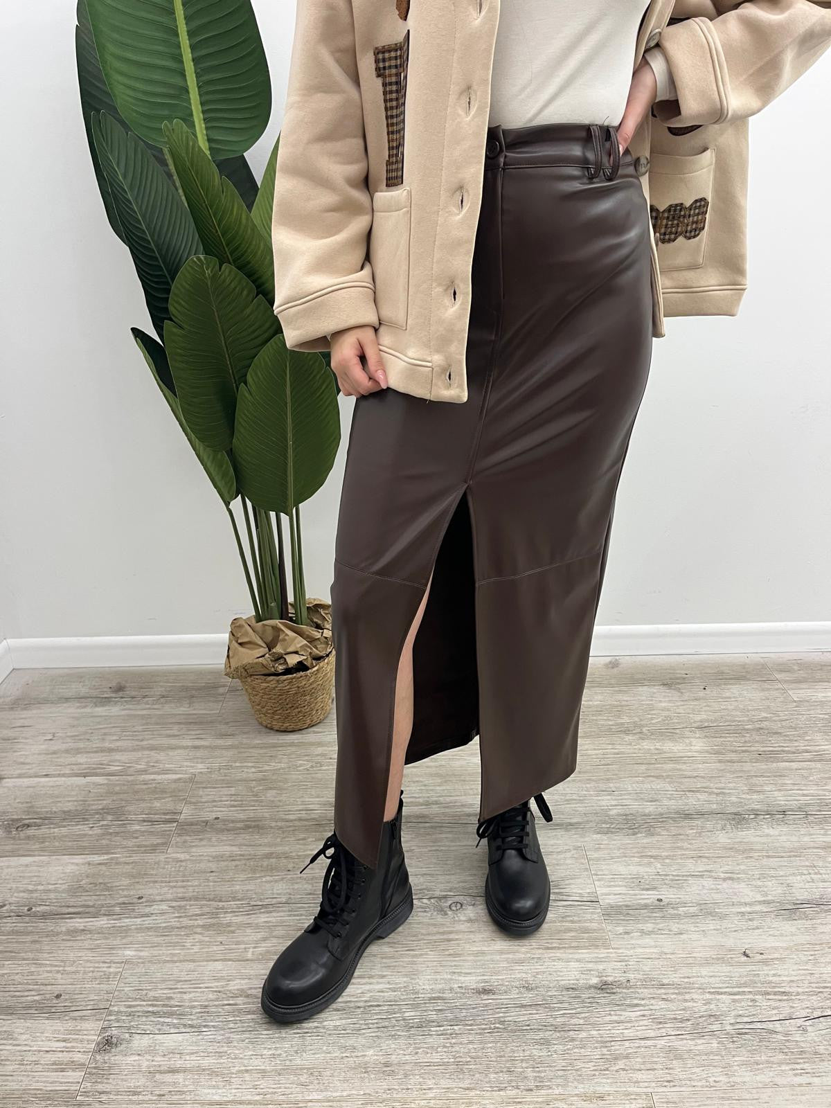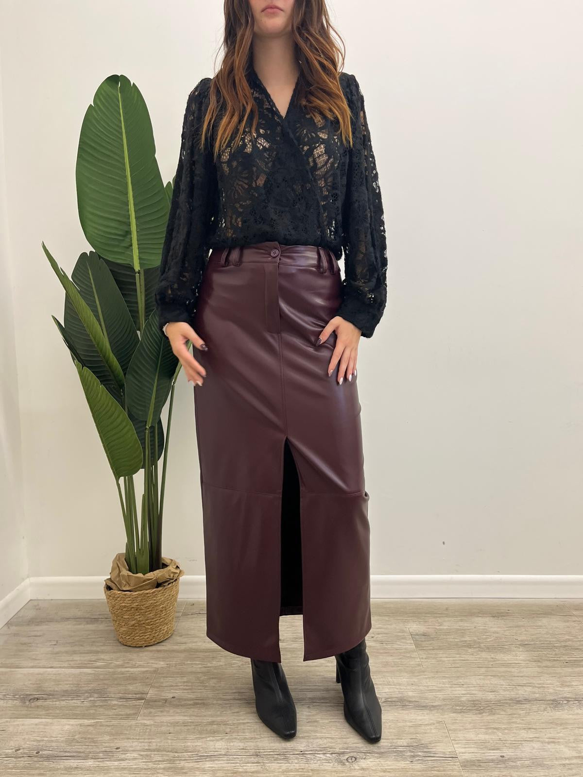 Gonna lunga in ecopelle effetto martellato con spacco frontale, passanti in vita e chiusura mediante bottone più zip.