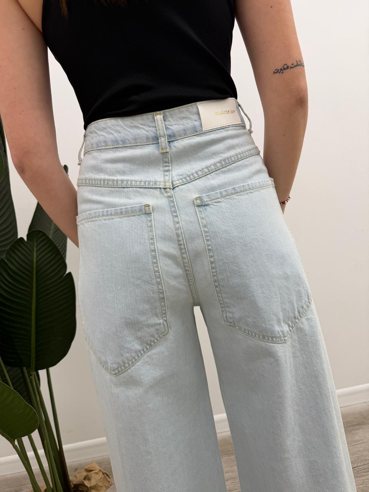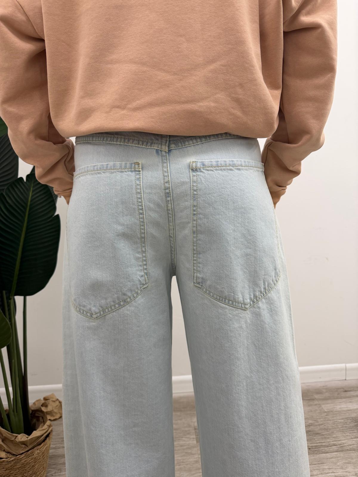 VESTIBILITA': modello baggy-fit a vita medio-alta con fianco morbido, gamba ampia e dritta