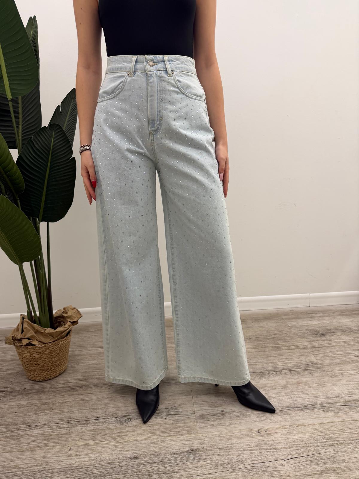 Jeans a 5 tasche lavaggio chiaro leggermente slavato con strass applicati frontalmente e ampi tasconi posteriori, passanti in vita e chiusura mediante bottone più zip.