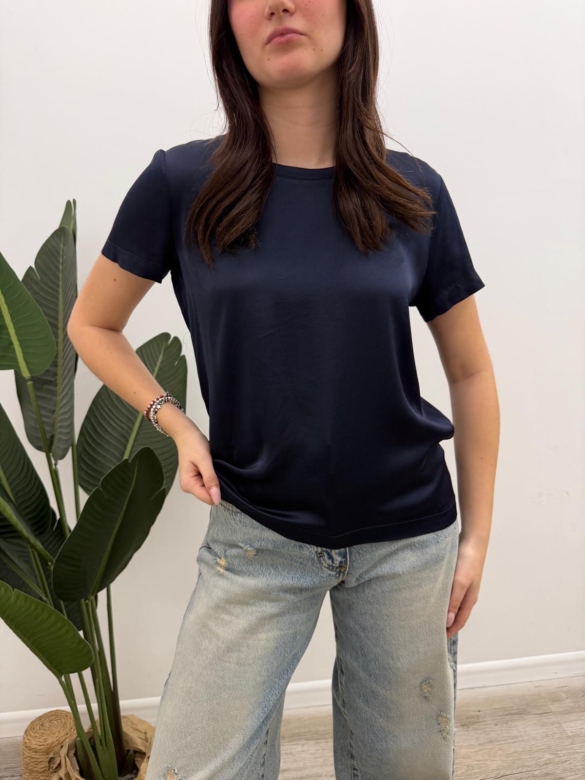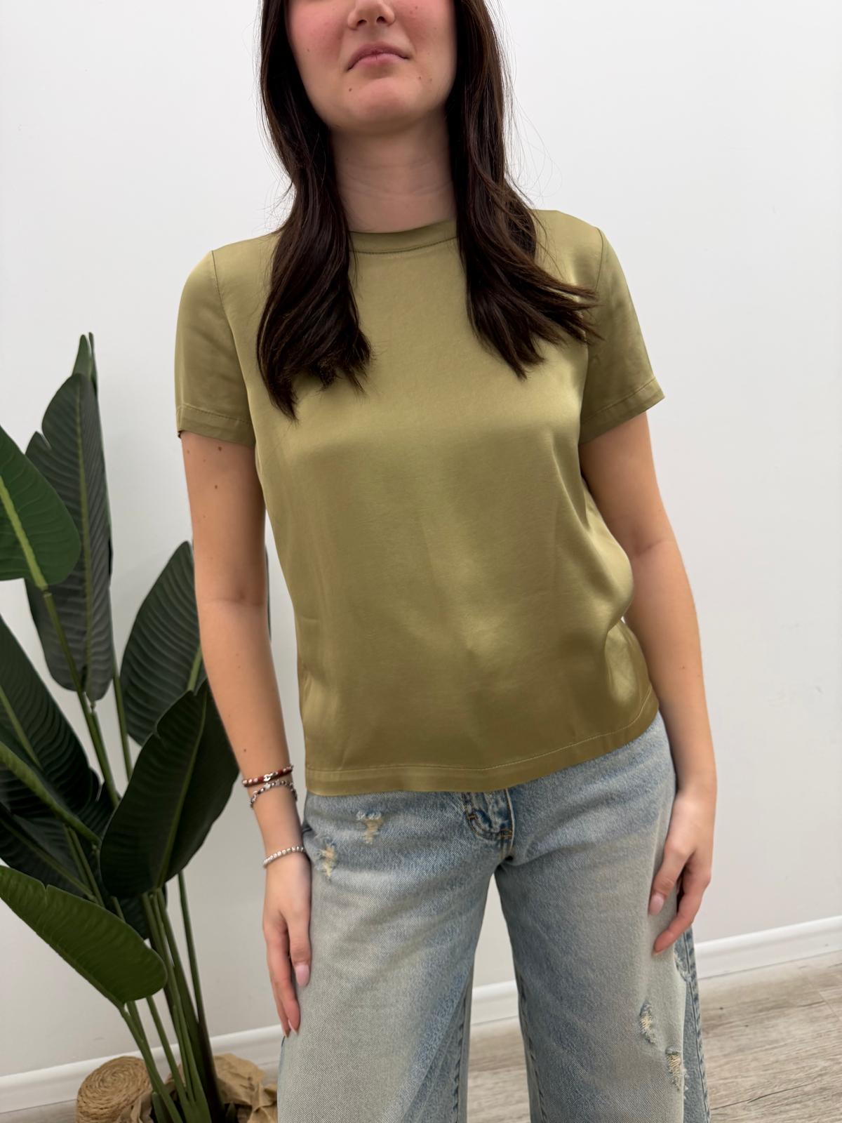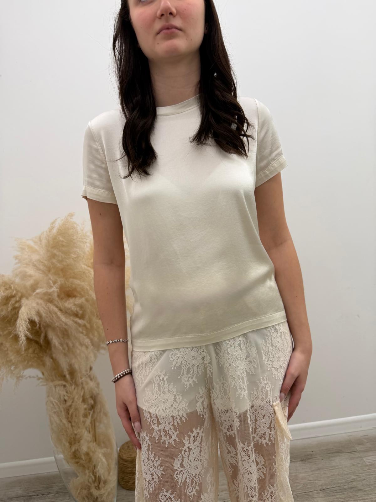 Maglia con scollo rotondo in tessuto lucido fluido simil raso a manica corta.