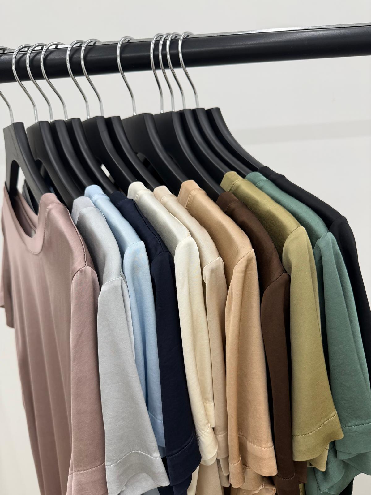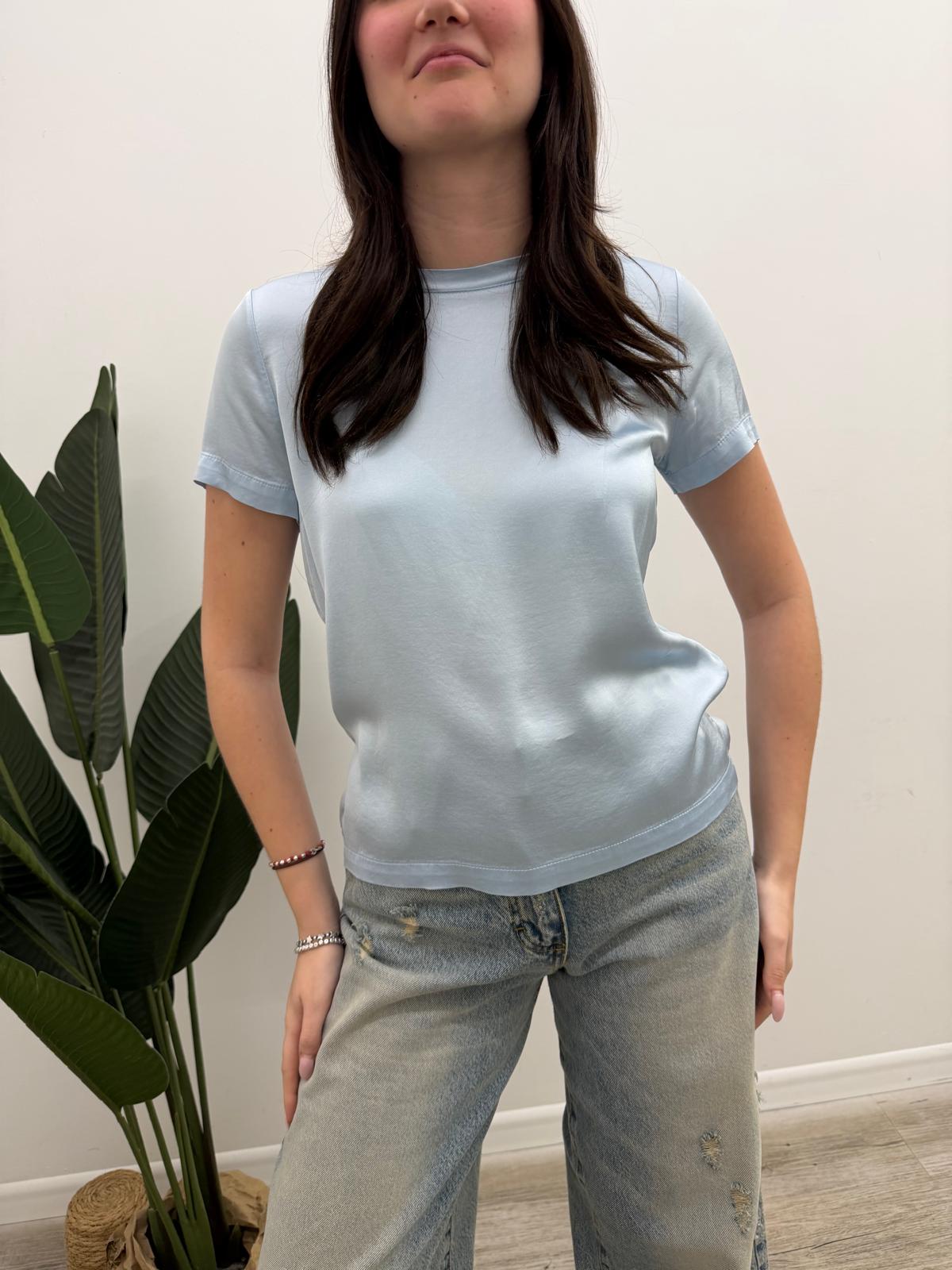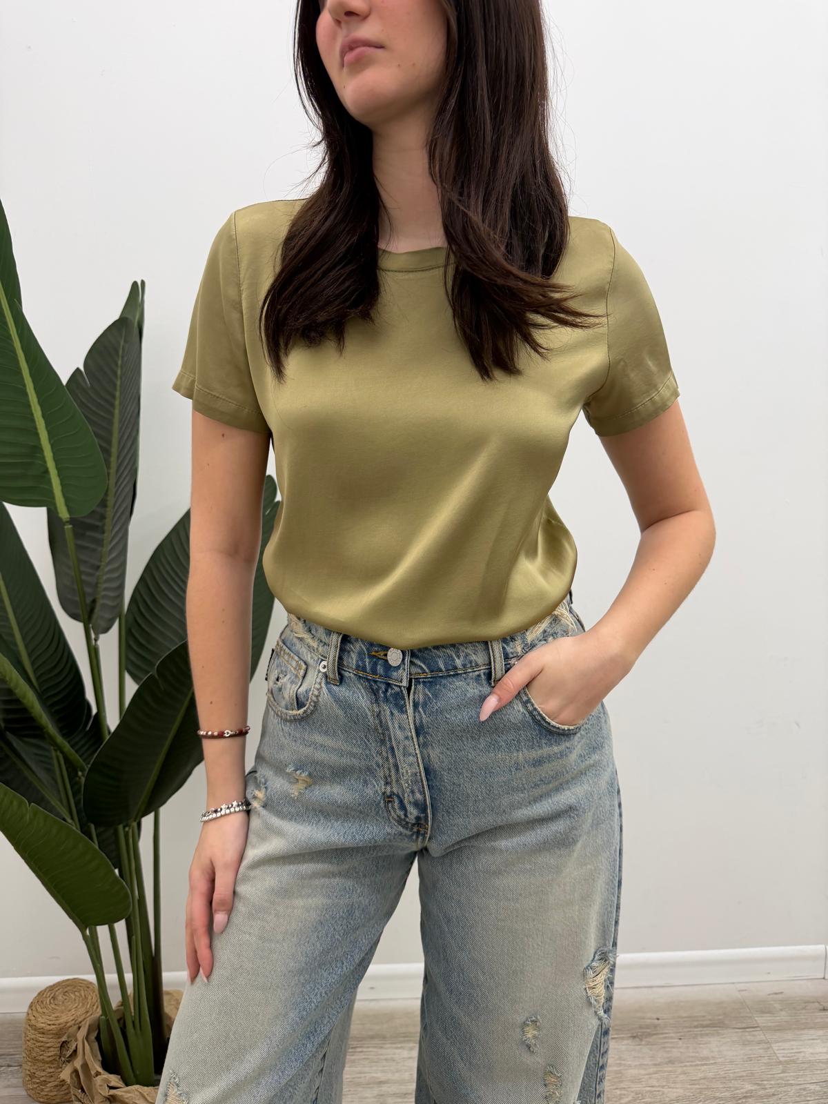 Maglia con scollo rotondo in tessuto lucido fluido simil raso a manica corta.