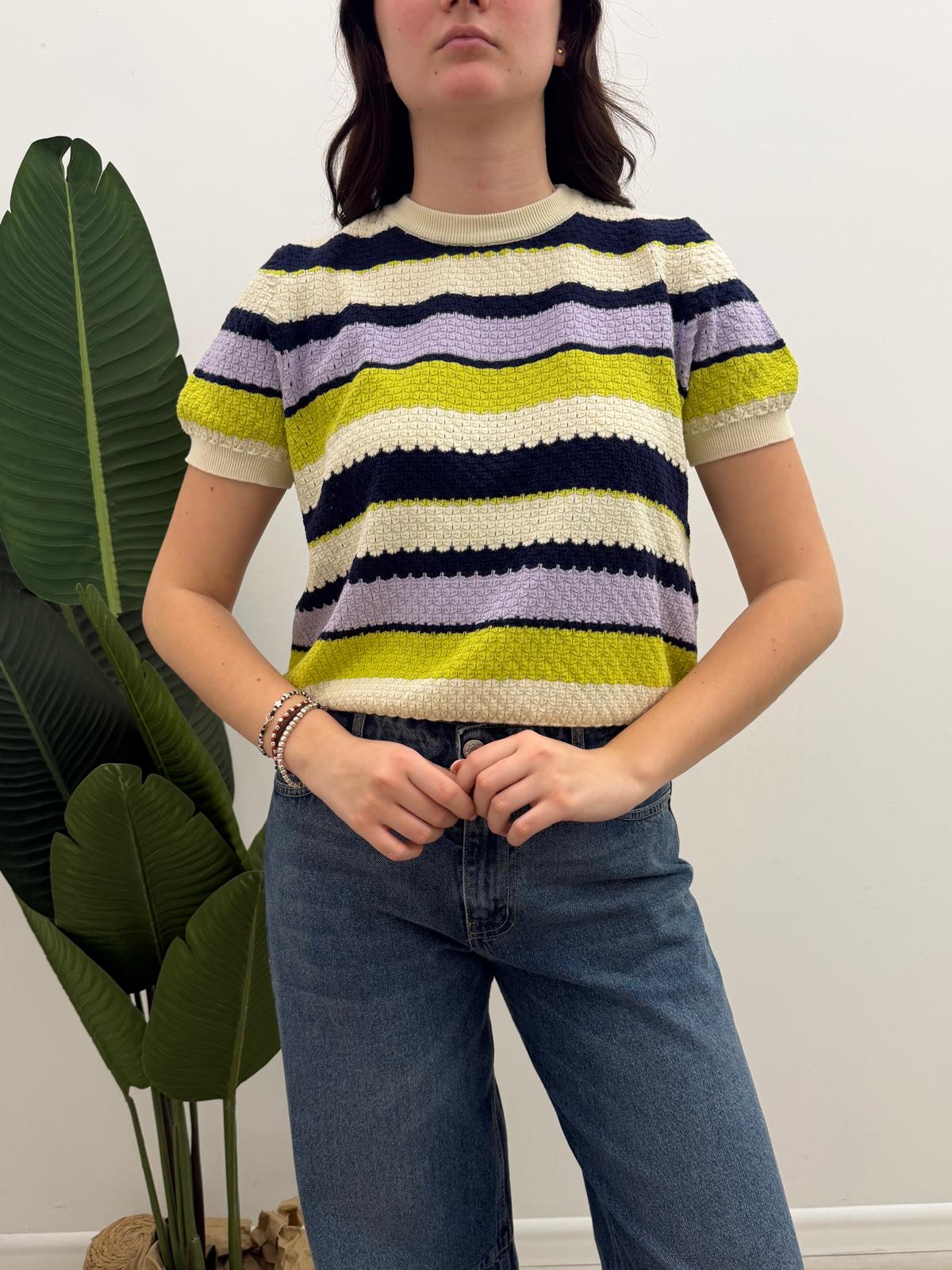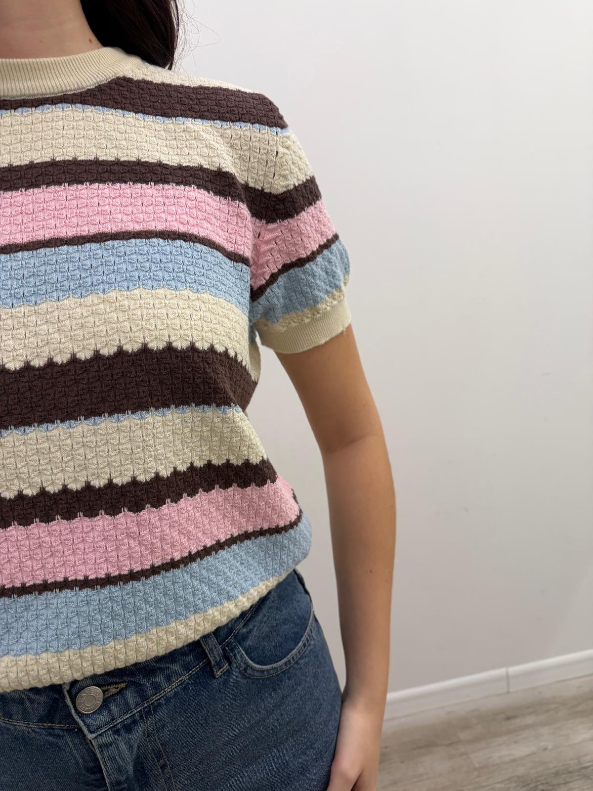 Maglia a mezza manica rigata leggermente traforata con scollo rotondo e rifiniture a costine del collo, fondo e polsini.
