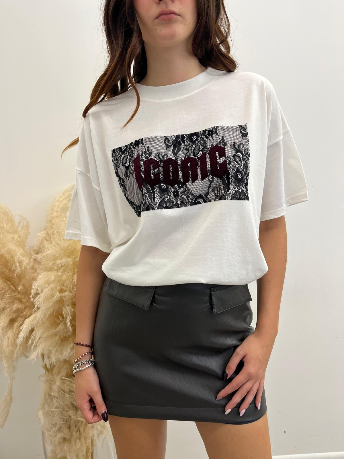 Minigonna in ecopelle effetto martellato lucido con doppia finta tasca più patta frontale, sottogonna tono su tono e chiusura mediante zip invisibile posteriore.