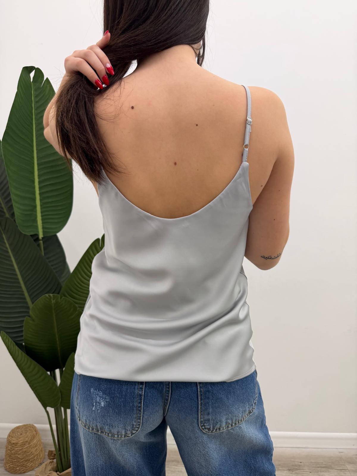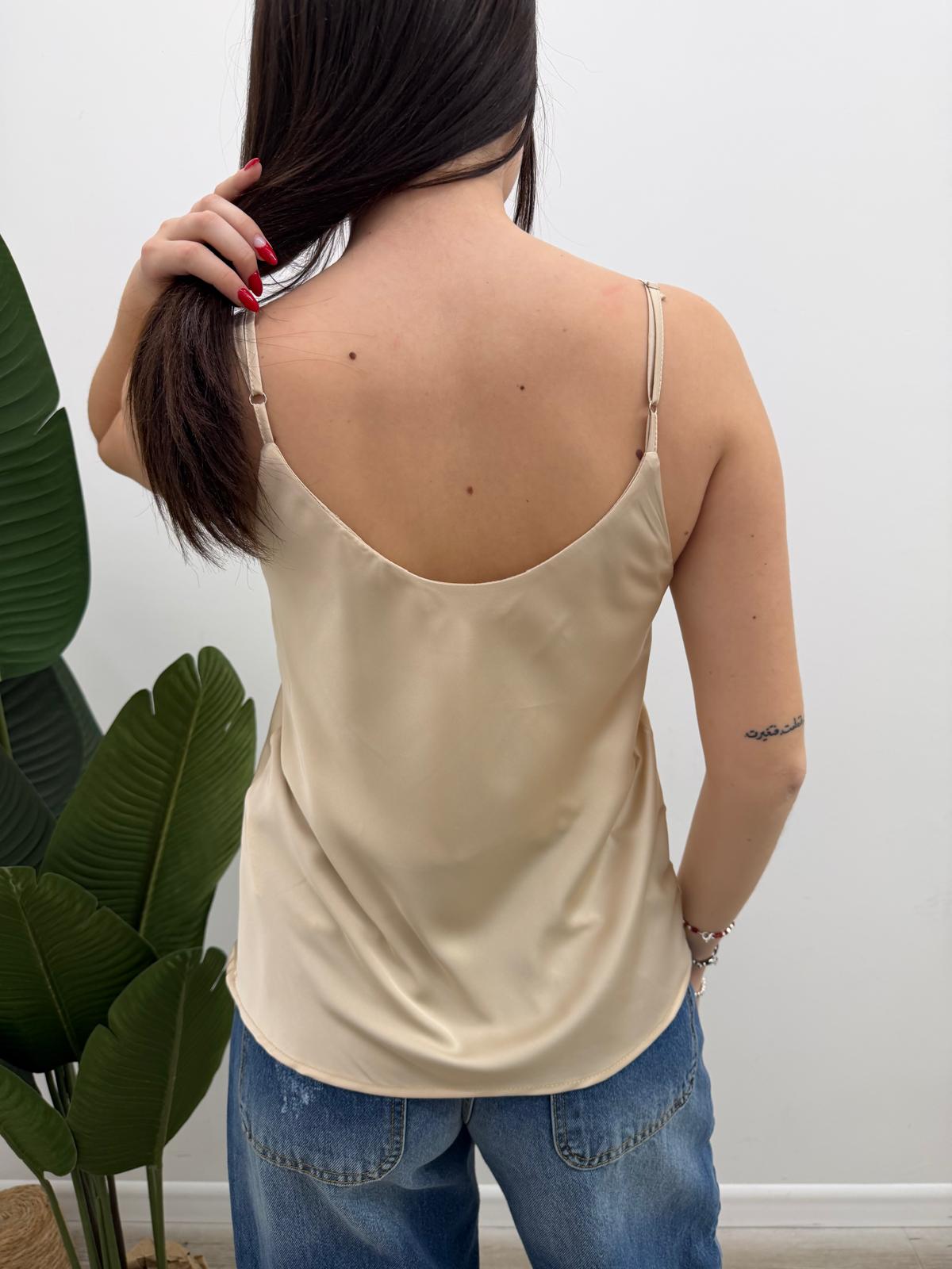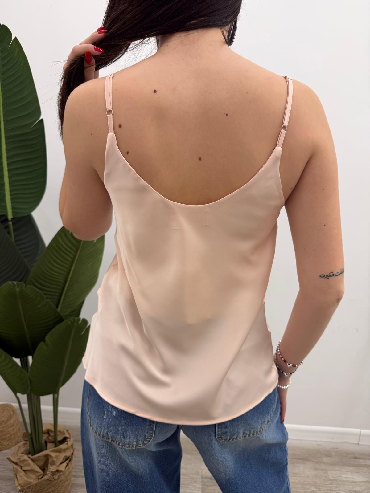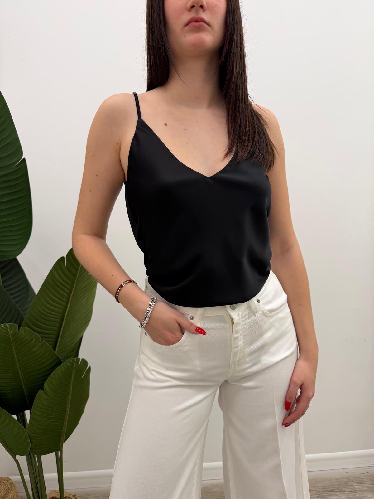 Top effetto raso con spalline sottili regolabili, profondo scollo a V sul davanti e leggermente stondato dietro.