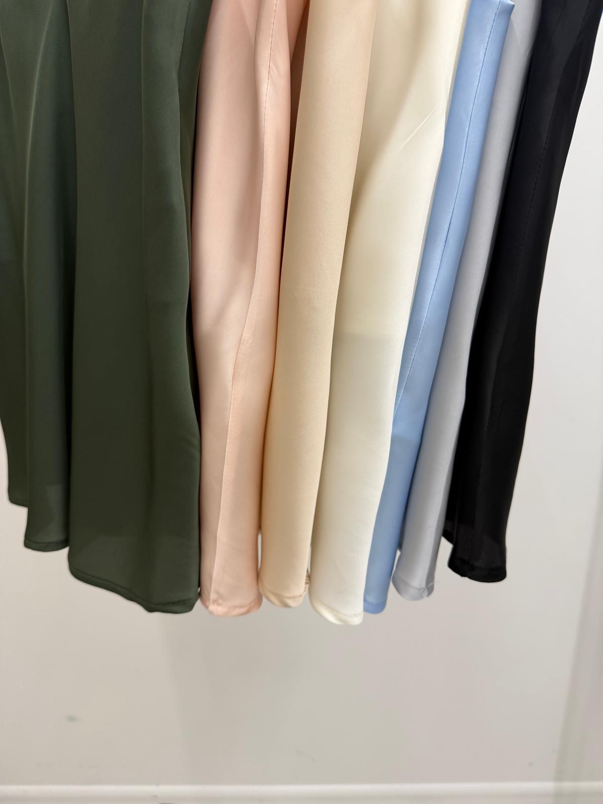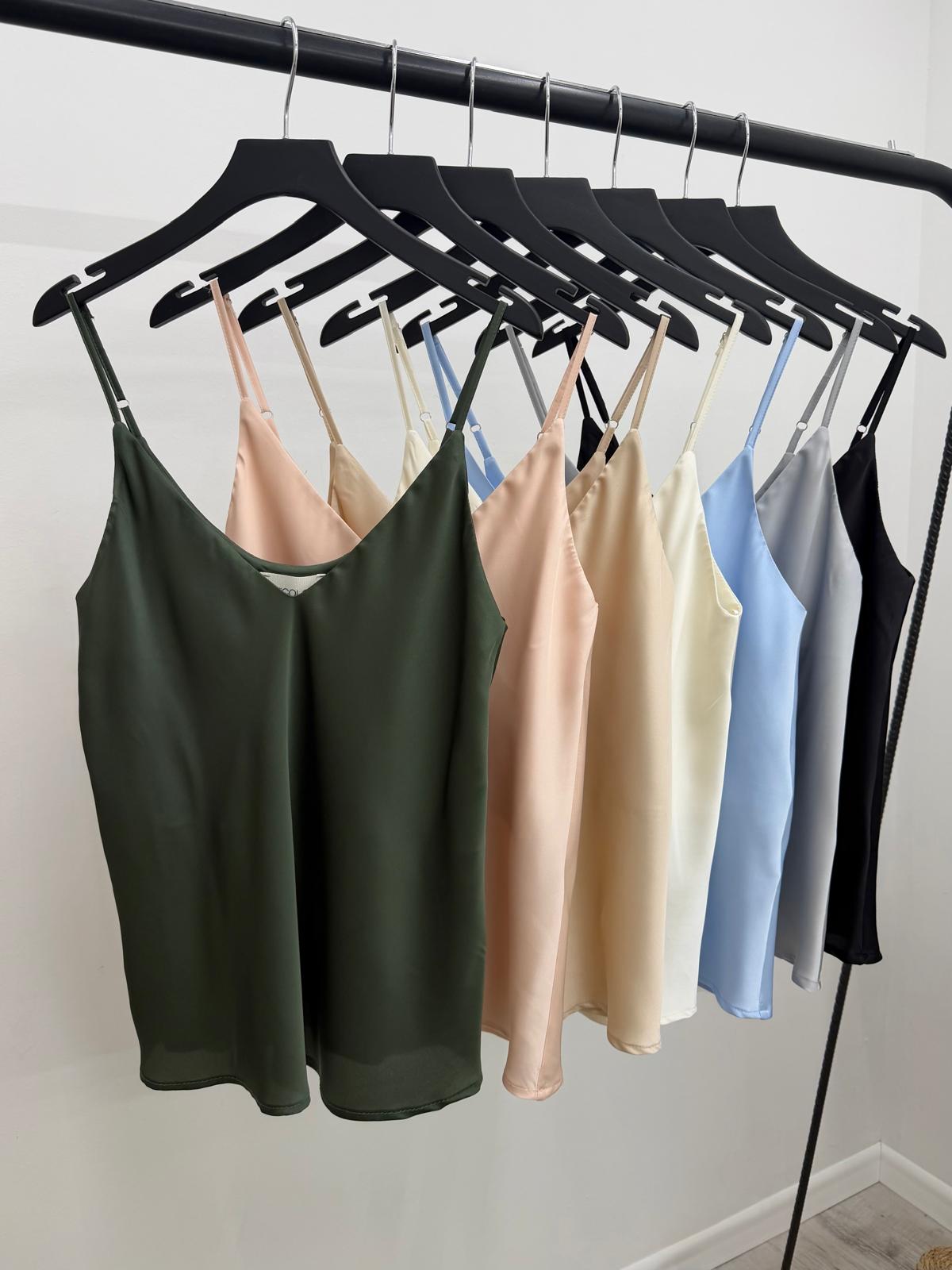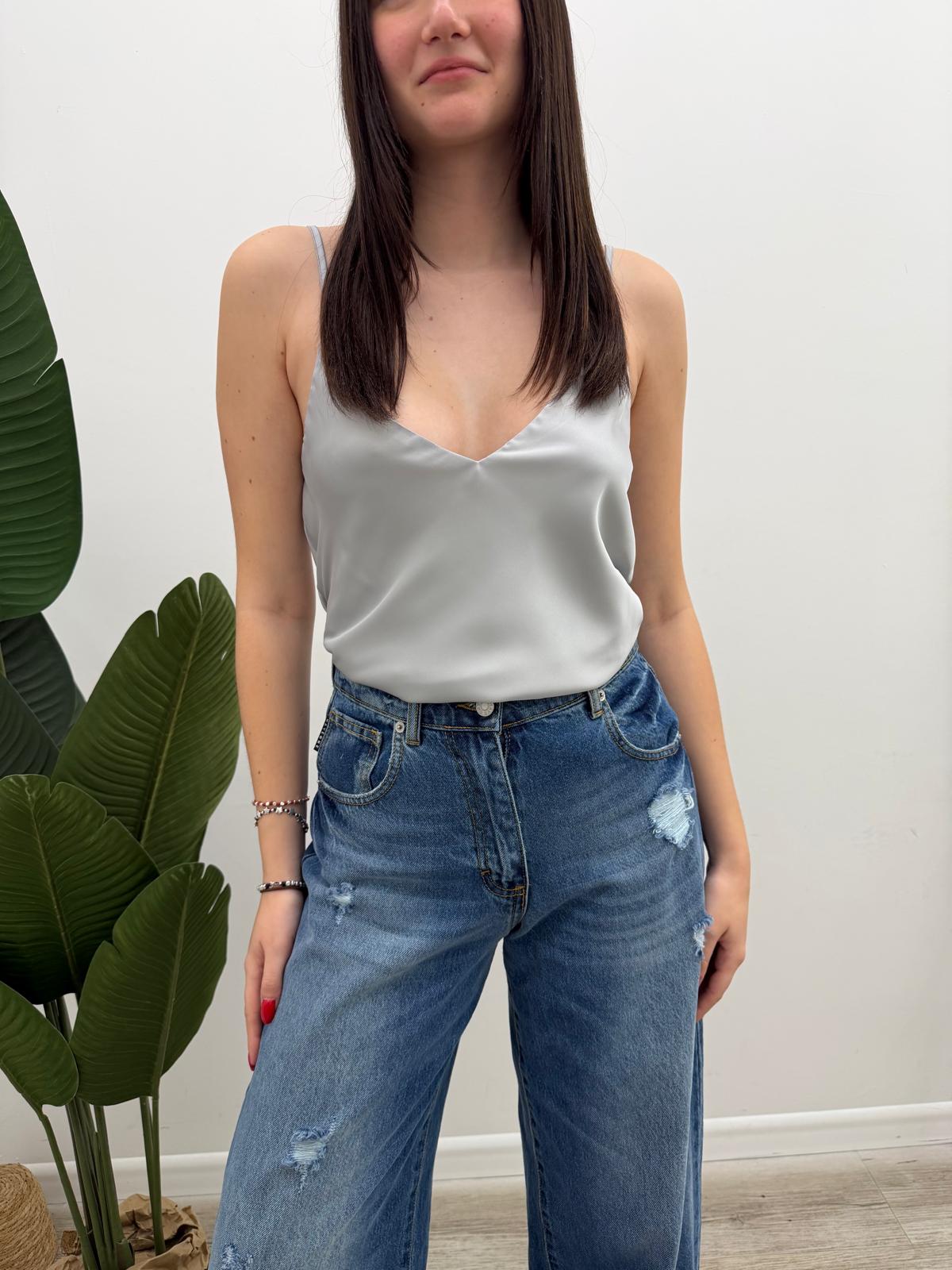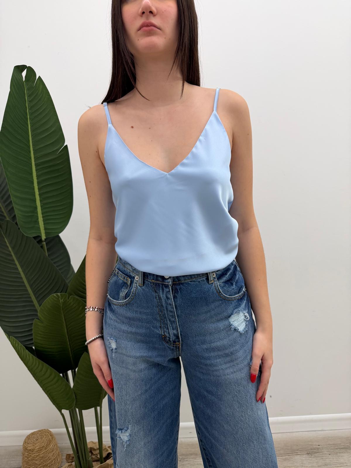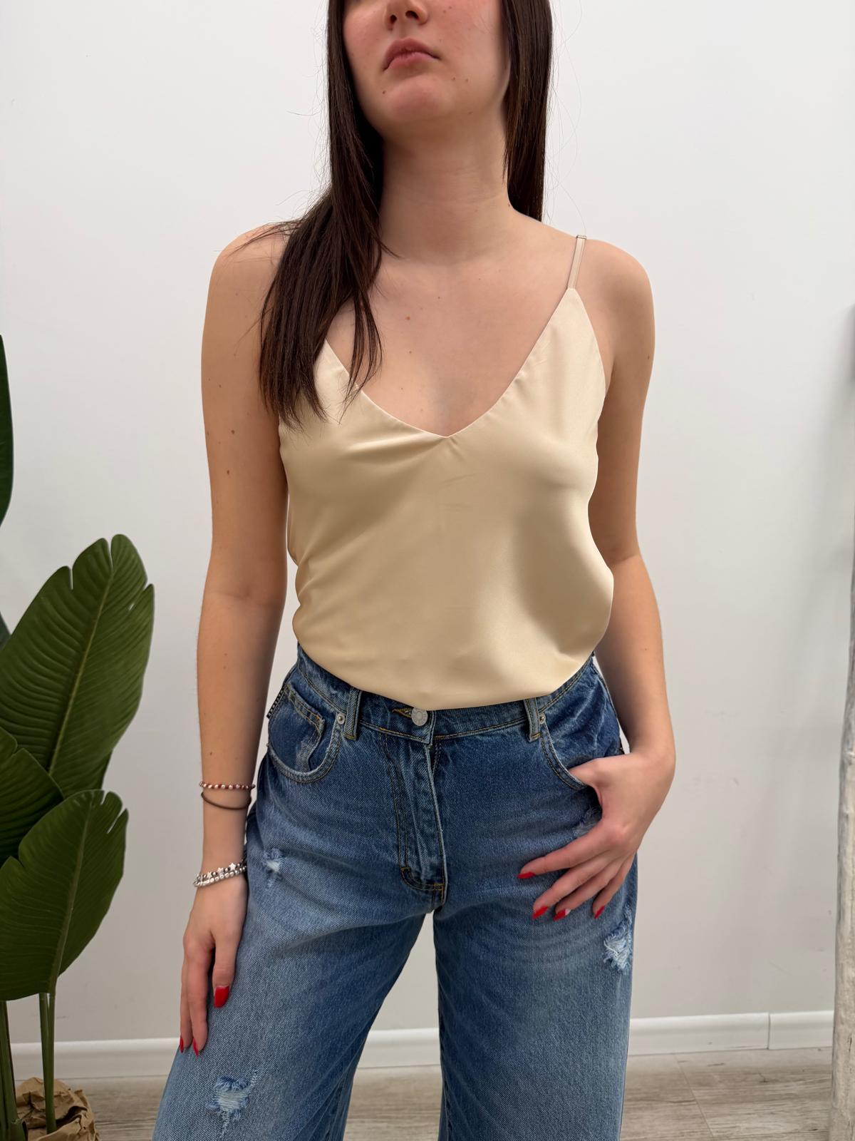 Top effetto raso con spalline sottili regolabili, profondo scollo a V sul davanti e leggermente stondato dietro.